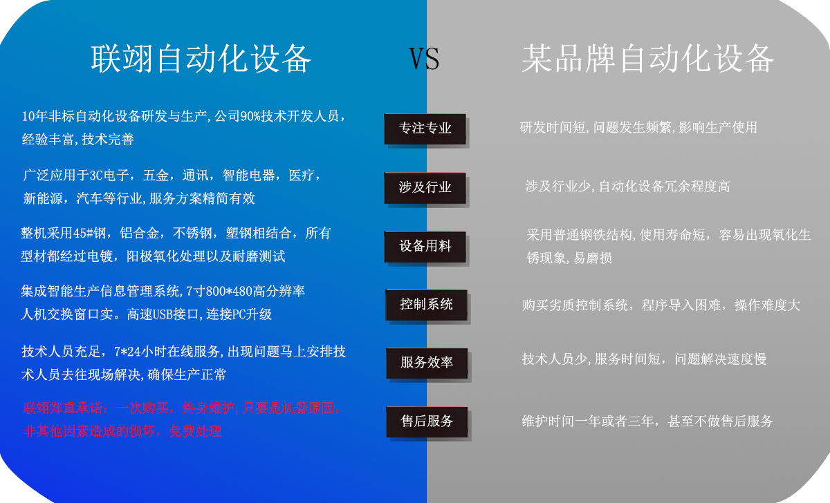 聯翊專注于助力企業邁向自動化,減少人工成本,增加生產能力,提升行業競爭優勢,從方案→設備→售后,一站式設備服務提供商,選擇聯翊,終身無憂。